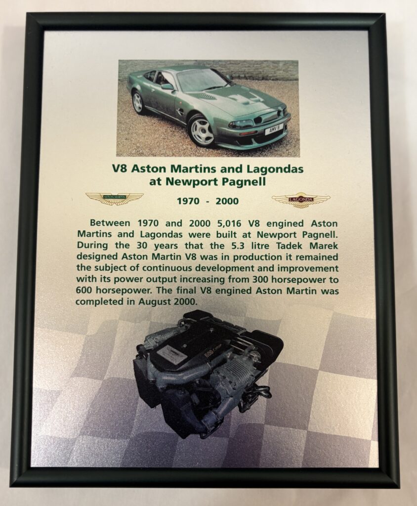 Phil Davey’s career was also closely tied to one significant element of Newport Pagnell’s achievements, the Aston Martin V8 engine. Built on site for 30 years, the V8 became a defining feature of the marque, and Phil was one of the engineers who worked on it during its life. In 2000, when the final V8 engined Aston Martin was completed at Newport Pagnell, Phil was presented with a plaque by Aston Martin Lagonda. Given with grateful thanks, it marked the end of an era and commemorated three decades of V8 engine production, not forgetting the people on the ground whose skill sustained it.