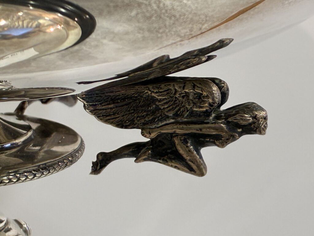 The trophy is presented on a circular wooden plinth, stained black. The smooth tapered base leads up to a ring with an overlaid rectangle design around it. Above this is a larger flat ring, with a plait pattern around the edge. From here, three rather scantily-clad winged ladies are balanced with their toes on the edge, and their wings on the under side of the trophy bowl. On closer inspection, it is hard to say whether there would originally have been four winged beings, and one has flown away, or if three were always the intention. One of the three certainly has had a historic repair, and is now positioned further away from the rim of the ring, as though leaping into the unknown.