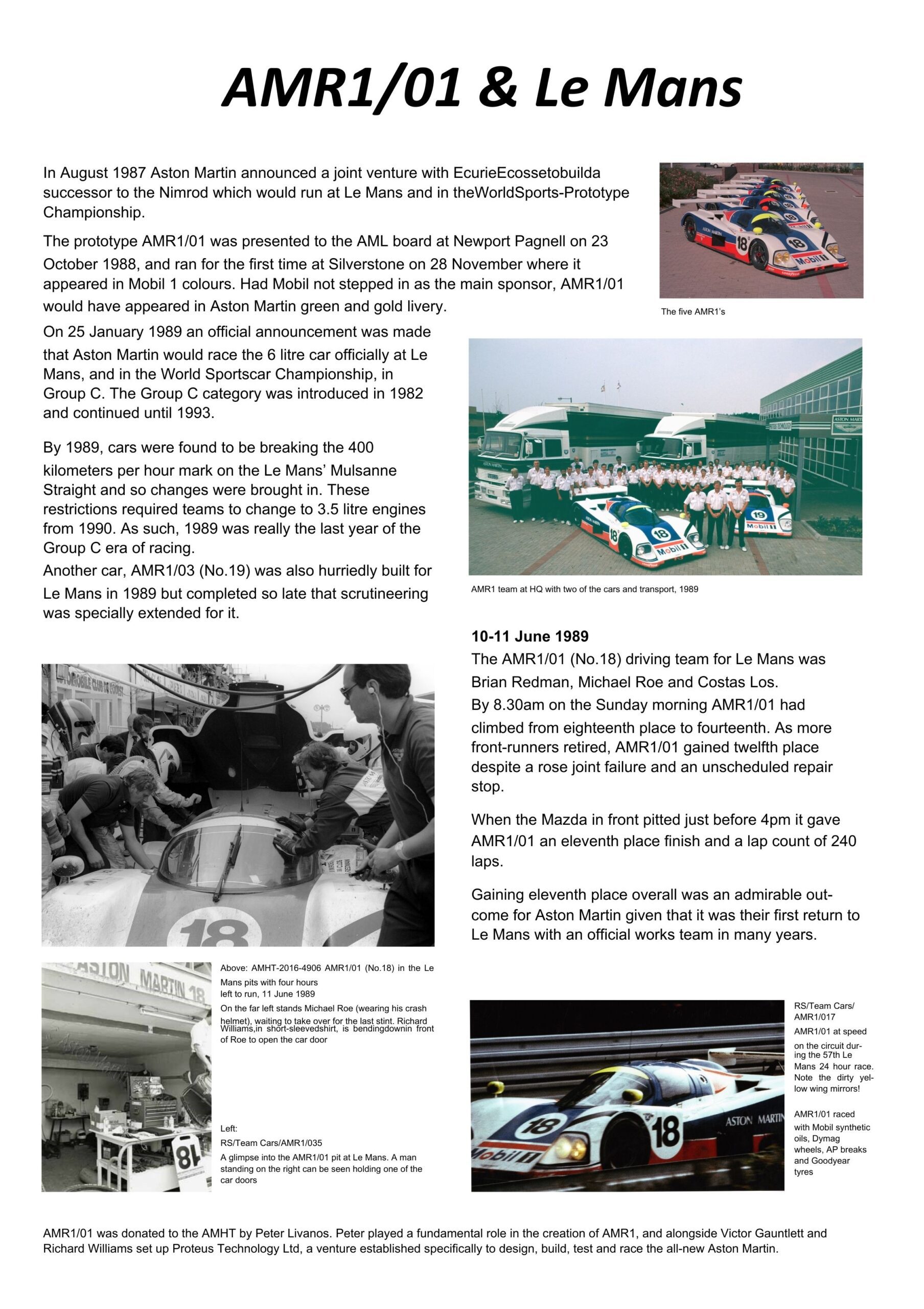 The cars were run by a company especially formed by AML shareholders Victor Gauntlett and Peter Livanos, called Proteus Technology (Protech) Ltd. with Richard Williams as Managing Director/Team Manager and Ray Mallock as Engineering Director and test driver