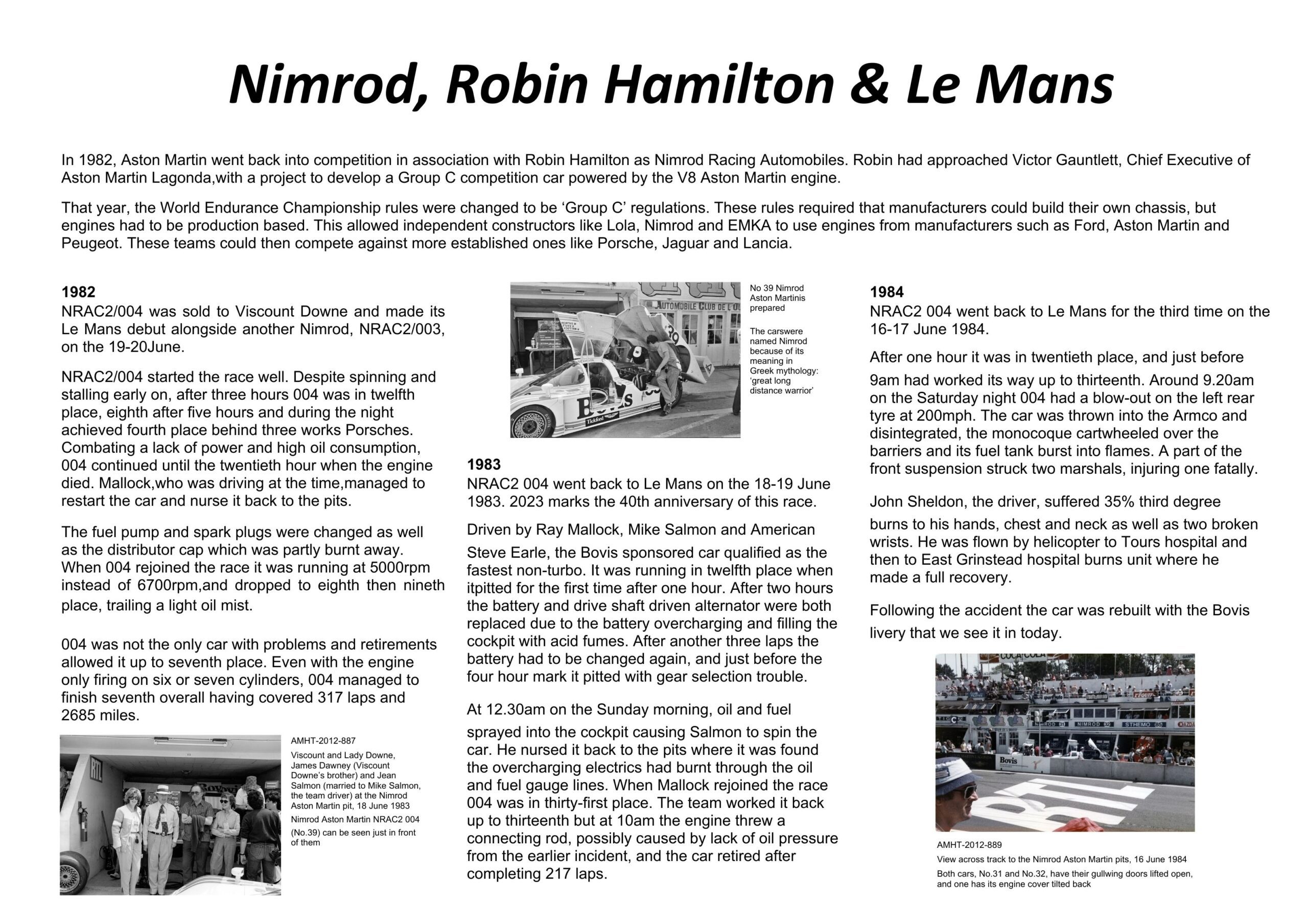 The Nimrod racing car was built by Nimrod Racing Automobiles Ltd., at Fauld near Burton-on-Trent, with a chassis designed by Eric Broadley of Lola, and Aston Martin V8 engines prepared by Aston Martin Tickford Ltd.