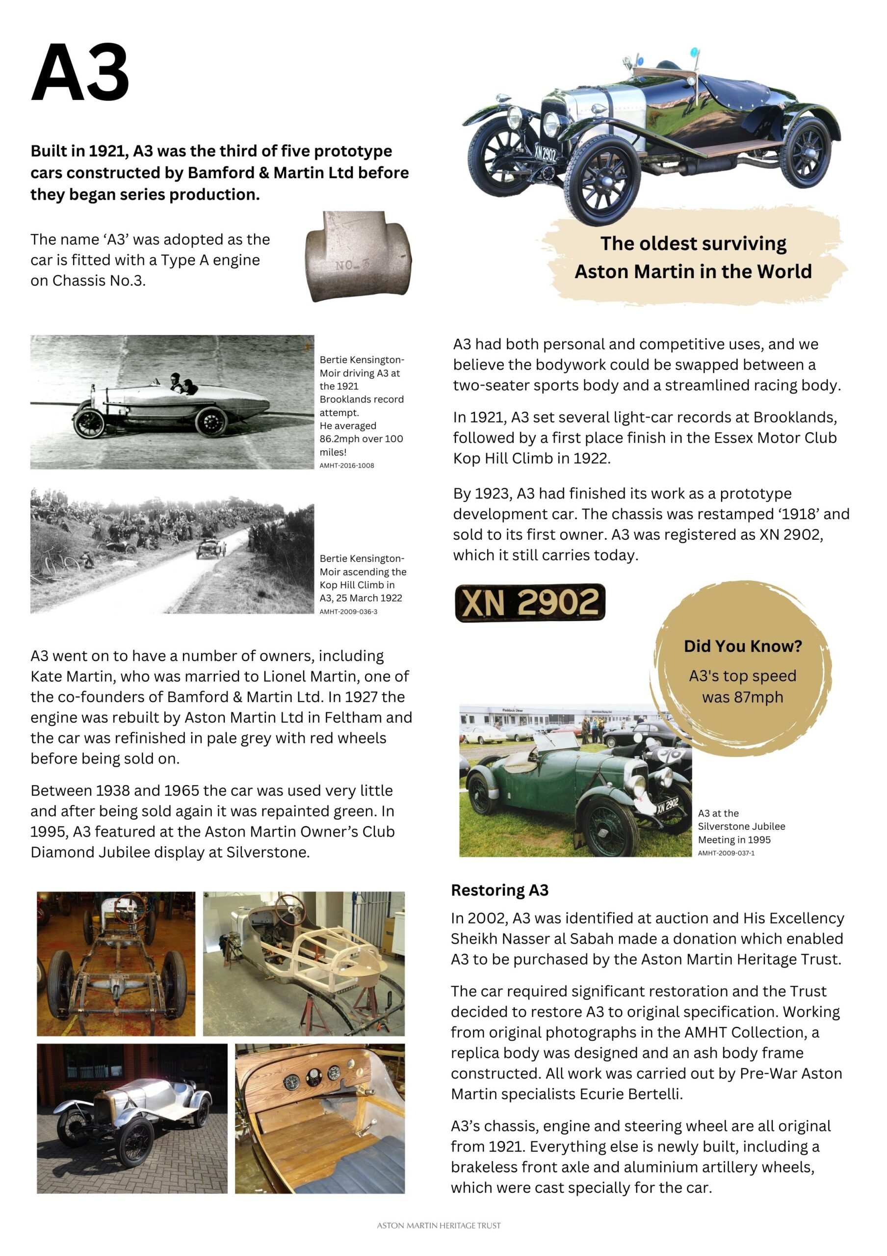 During the 2013 Aston Martin Centenary event in Kensington Gardens, A3 was the very first car in a timeline of 101 significant Aston Martins.